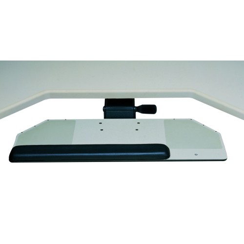 27" Wide Platform Holds Keybaord and Mouse, "Lift and Lock" adjustment means no levers to move, built-in wrist pad and very sturdy so no "bounce" when keyboarding. Built doe sdesk corner.